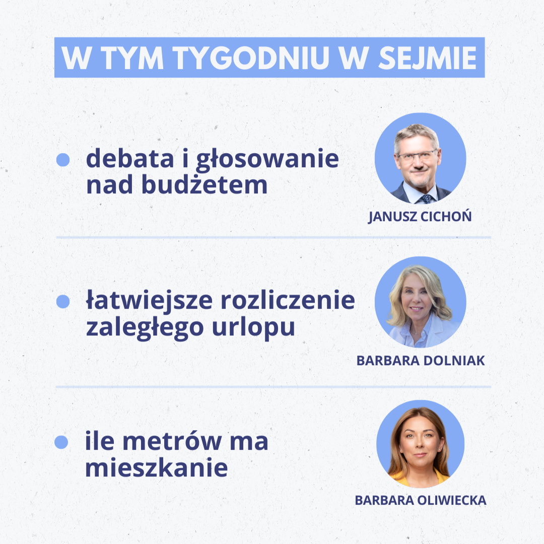 W tym tygodniu czekają nas aż dwa posiedzenia Sejmu. 46. w środę i czwartek i 47. w piątek. Wszystko ze względu na prace nad budżetem. Dodatkowe sprawozdanie Komisji Finansów Publicznych w sprawie budżetu może być bowiem procedowane dopiero na – formalnie – kolejnym posiedzeniu. Co znajdziemy w budżecie i czym jeszcze posłowie zajmą się w tym tygodniu?